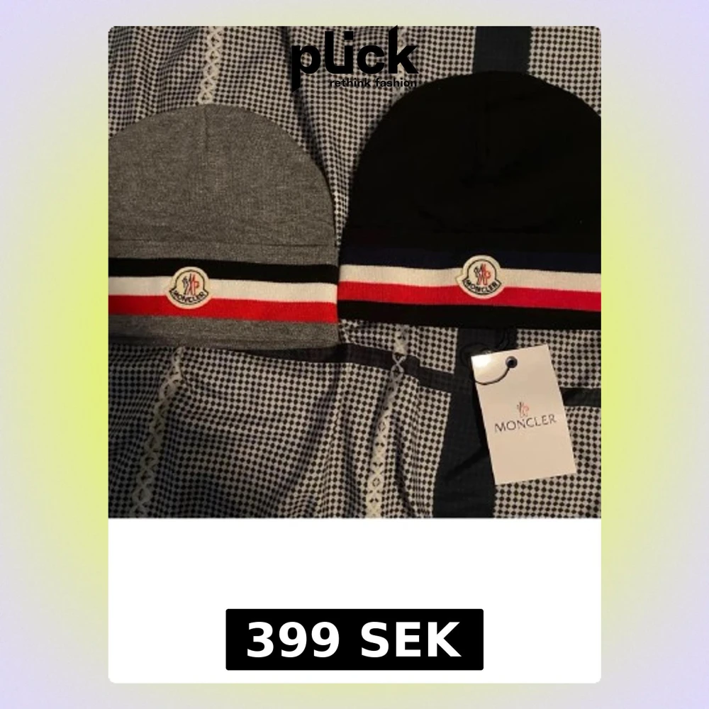 En Moncler mössor, en i grått och en i svart, båda med ett randigt band i svart, vitt och rött samt Moncler-logga framtill. Klassisk och stilren design som passar perfekt till vintern. Mössorna är ribbstickade och har en mjuk känsla.