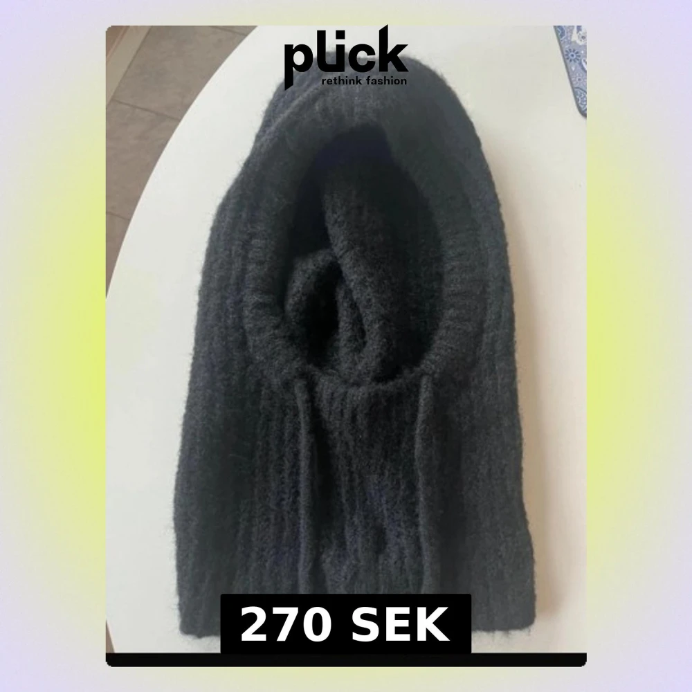Säljer en svart stickad balaclava i mjukt och fluffigt material. Modellen har en rundad öppning för ansiktet och snören framtill för att justera passformen. Perfekt för dig som vill ha en trendig och varm huvudbonad under kalla dagar.