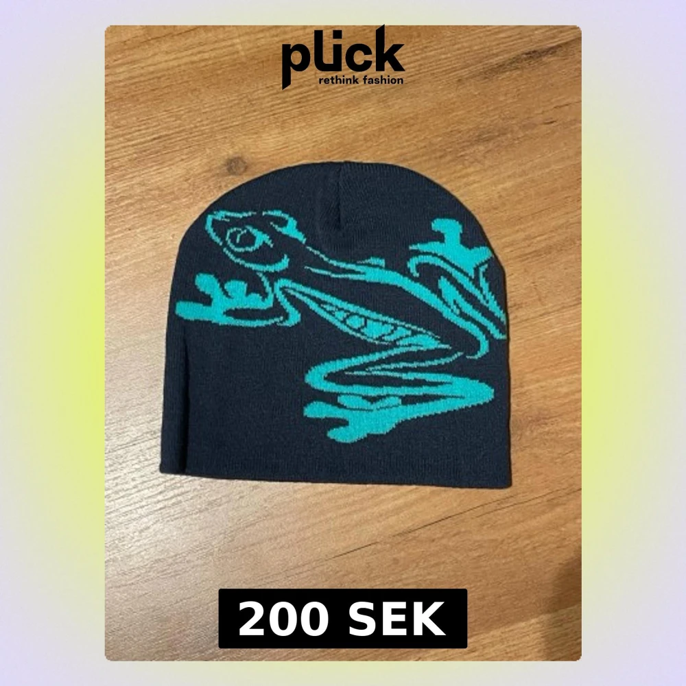 Säljer en svart, stretchig mössa med en stor turkos groda som motiv på framsidan. Mössan är tunn och smidig, perfekt för dig som vill ha en cool accessoar med unik design. Passar både till streetwear och chill vardagsstil.