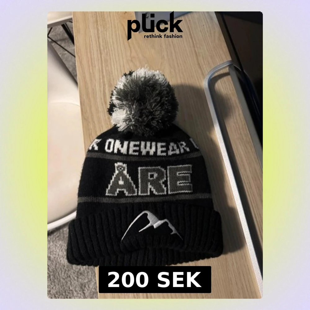 Snygg svart mössa från OneWear med stor vit text 'ÅRE' framtill och en broderad bergslogga. Mössan har en svartvit tofs på toppen och ribbstickad kant. Perfekt för kalla dagar och vintersäsongen.