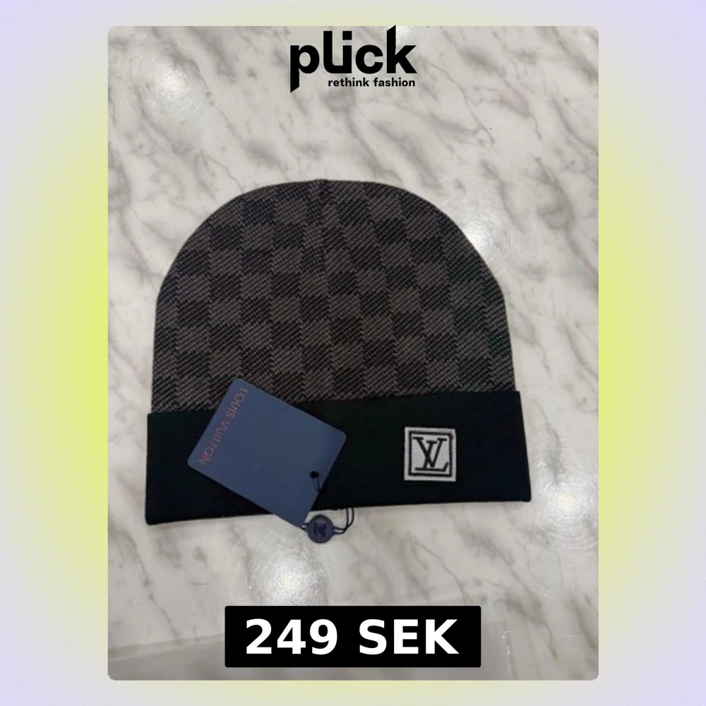 En ljus svart stickad mössa med rutigt mönster och uppvikt kant, med en liten logotyp framtill och etikett kvar.