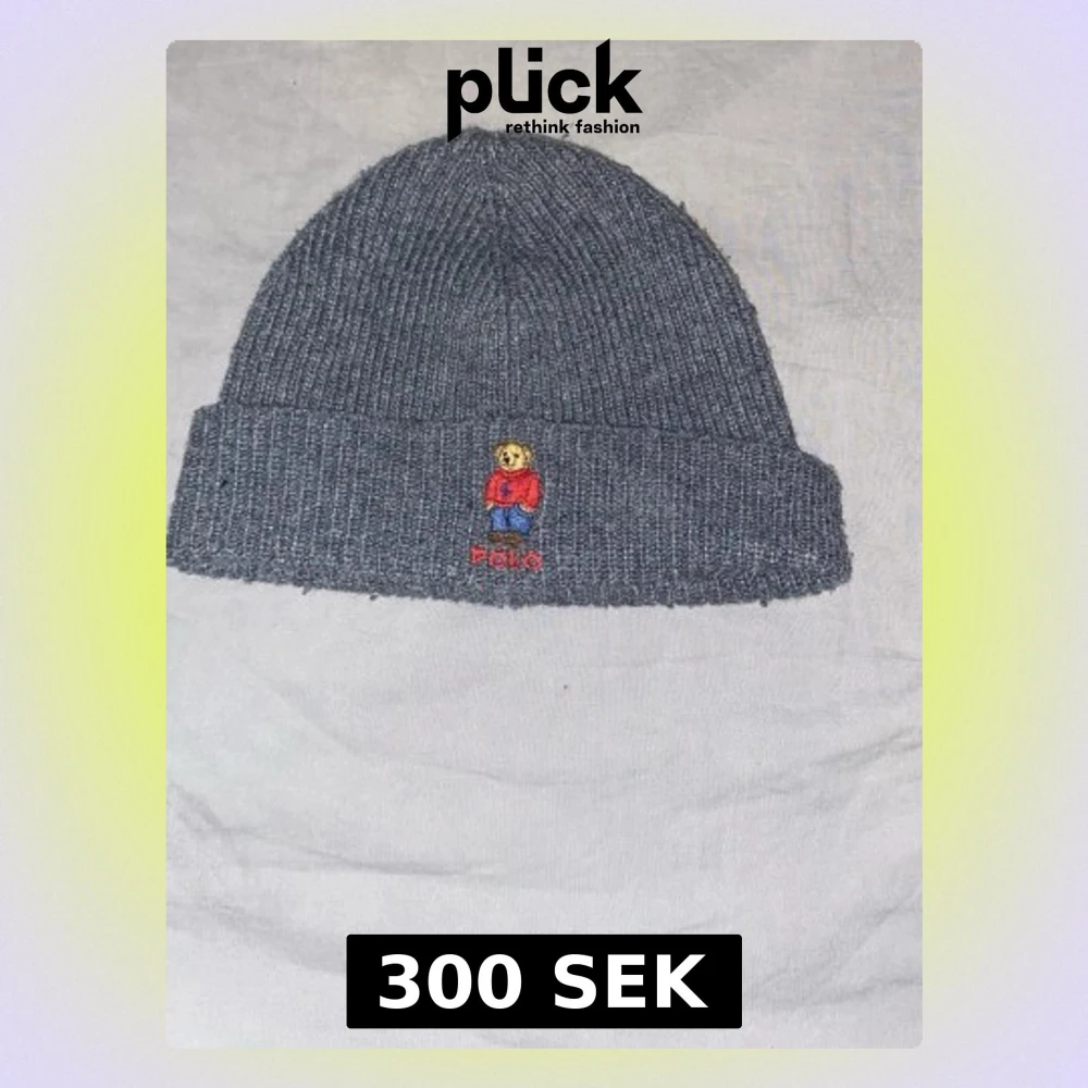 Grå ribbstickad mössa från Polo Ralph Lauren med uppvikt kant. På framsidan finns en broderad björn i röd tröja och blå byxor samt texten 'Polo' i rött. Klassisk och stilren design som passar till det mesta.