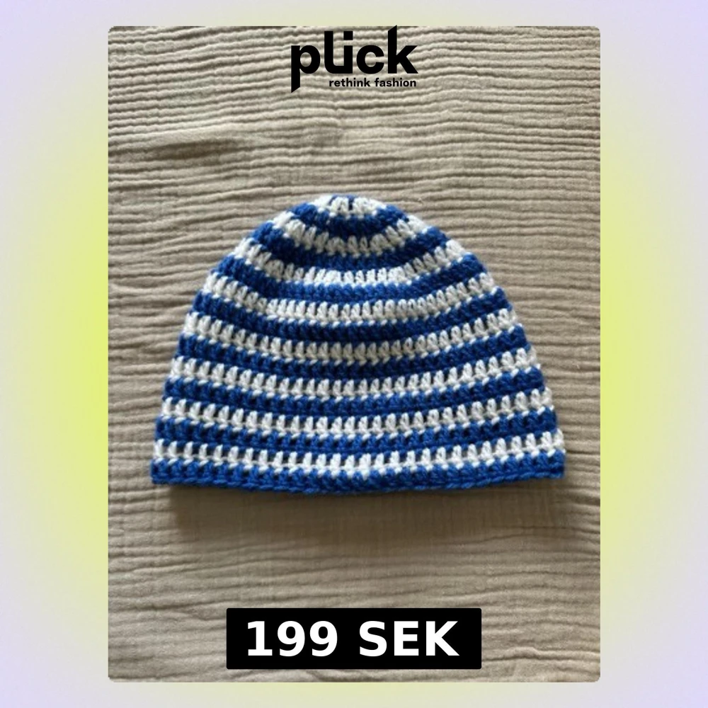 Egentillverkad virkad mössa i ett blått och vitt garn. Tvättas i 30 grader
