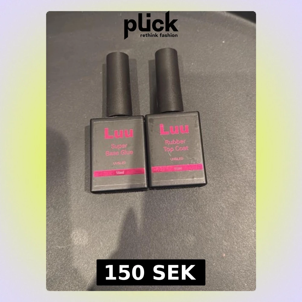 Två flaskor nagelprodukter från Luu: Super Base Glue och Rubber Top Coat. Båda är UV/LED-anpassade och kommer i svarta fyrkantiga flaskor med rosa text. Varje flaska innehåller 15 ml. Perfekt för dig som vill fixa snygga och hållbara naglar hemma.