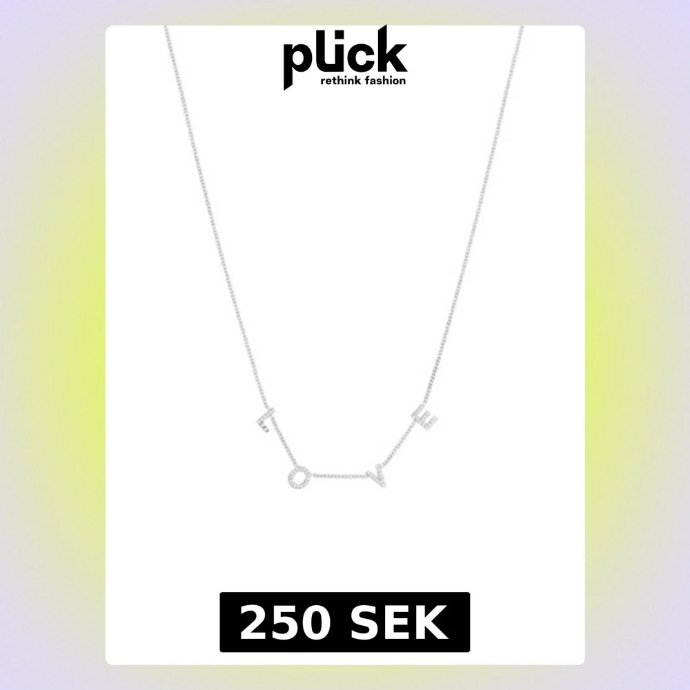 Stilrent halsband i silverfärg med tunnt kedja och bokstäverna LOVE framtill, dekorerade med små gnistrande stenar. Fick för något år sedan men har ej använts. Nypris 399kr