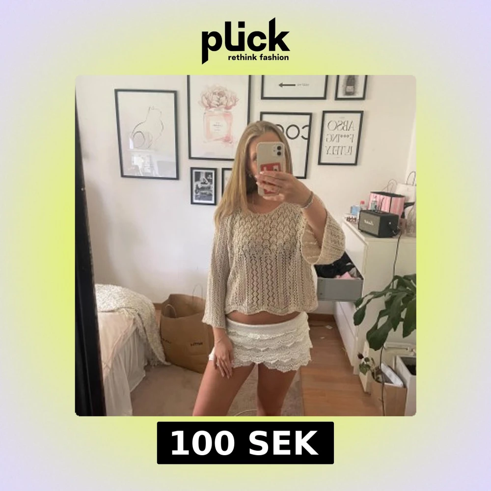 Superfin beige stickad tröja med snyggt virkat mönster och vida, lite kortare ärmar. Tröjan har en avslappnad passform och är perfekt att styla över ett linne eller bikini. Ger en chill och bohemisk vibe till outfiten.