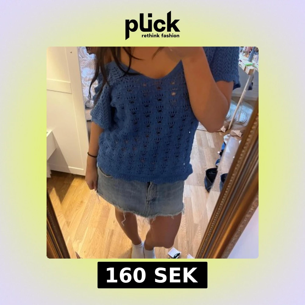 Säljer en blå stickad topp från ONLY med ett luftigt mönster. Toppen har korta ärmar och en avslappnad passform, perfekt för våren!💕