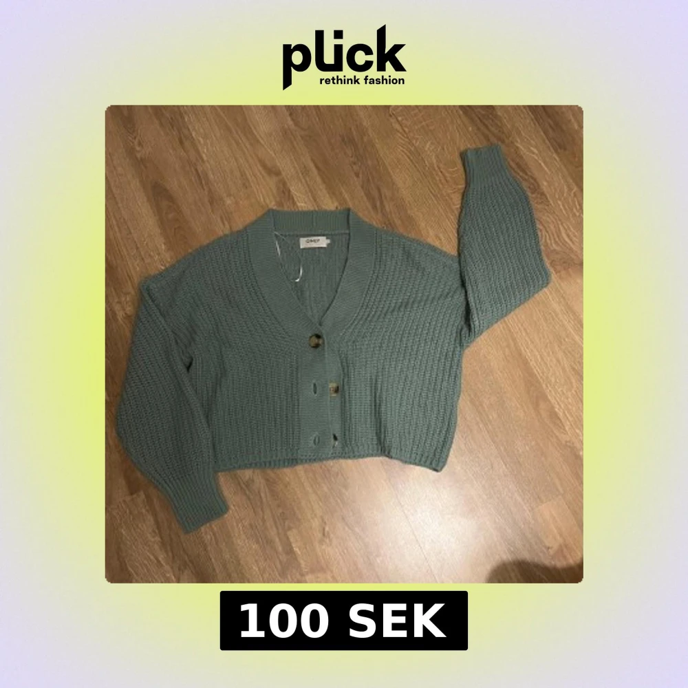 Säljer en mysig grön stickad kofta från ONLY. Koftan har en croppad passform med knappar framtill och långa ärmar. Perfekt för kyligare dagar!