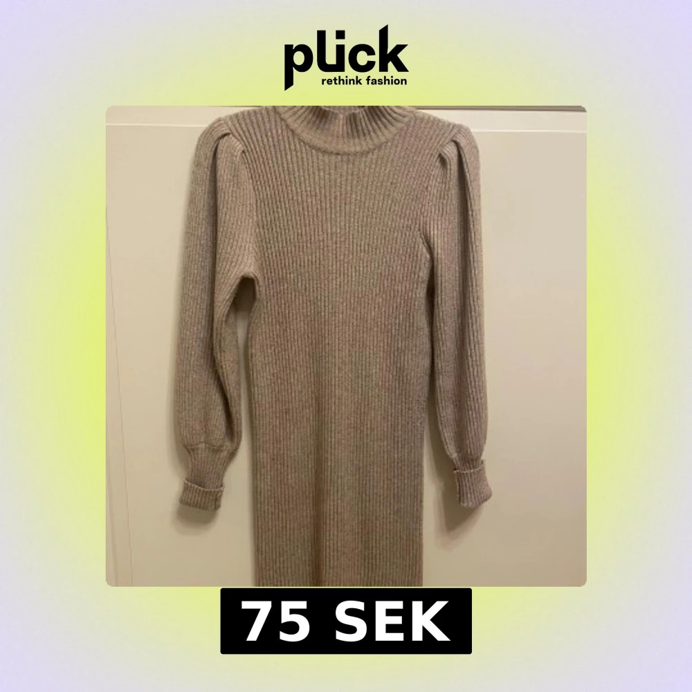 Snygg beige stickad klänning från ONLY i storlek S. Klänningen har långa ärmar och en ribbad design som ger en stilren look. Perfekt för kyligare dagar med sin mysiga och varma känsla. Lite trasigt i en söm.