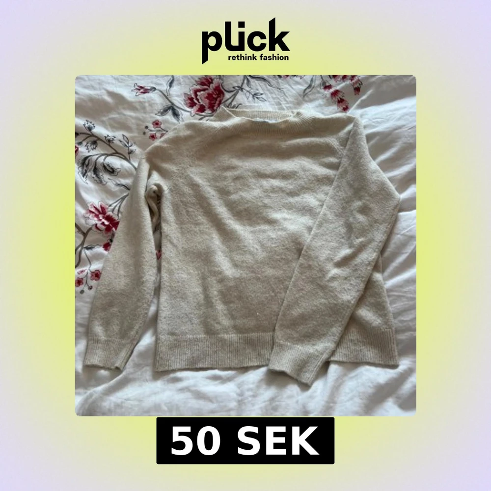 Säljer en mysig beige stickad tröja med långa ärmar och ribbstickade muddar. Perfekt för kyligare dagar. Passar bra till både jeans och kjol.