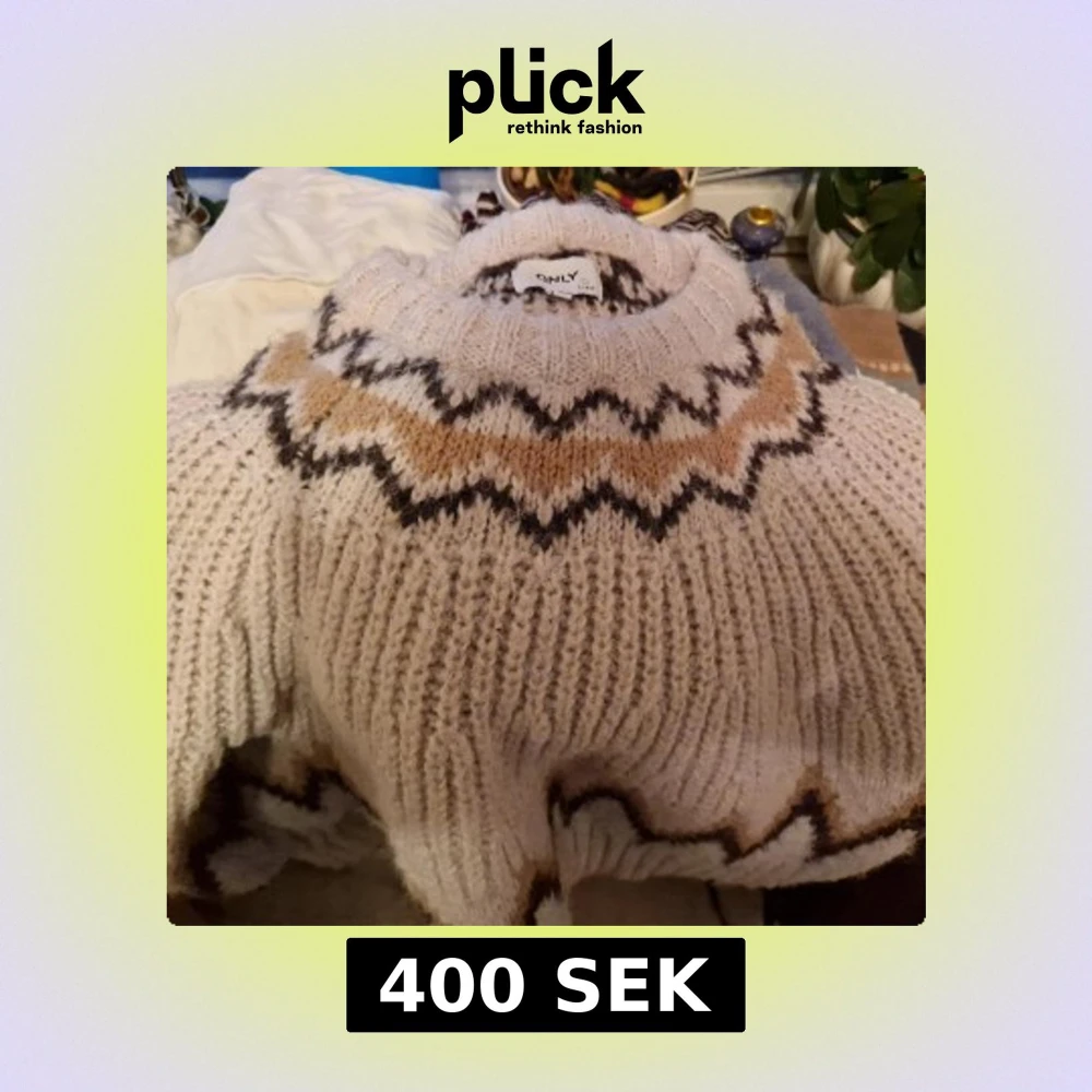 Mysig vit stickad tröja från ONLY med ett snyggt mönster i svart och beige runt halsen och ärmsluten. Perfekt för kyliga dagar. Tröjan har en ribbad struktur och långa ärmar.