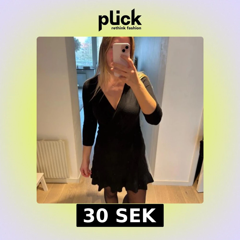 Säljer en svart omlottklänning från ONLY i storlek XS. Klänningen har v-ringad hals, trekvartsärm och volangkant nedtill. Den är figurnära och har en mjuk, stickad känsla som gör den superbekväm. Perfekt för dig som gillar stilrena och enkla plagg med snygga detaljer.