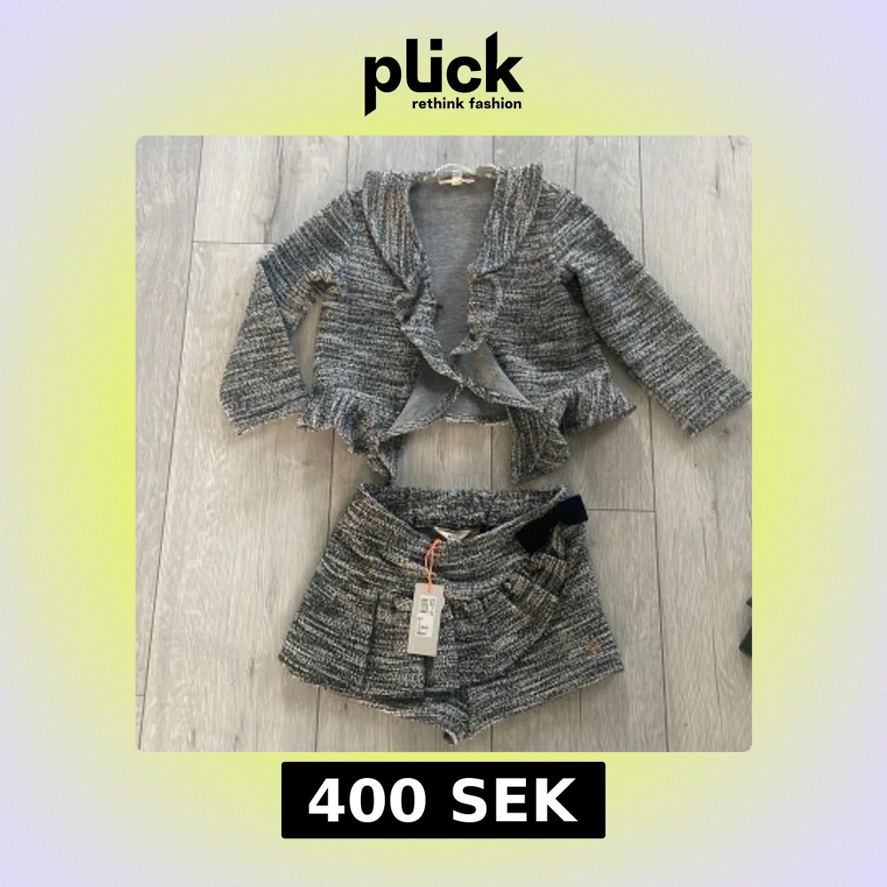 Super Snygga gråmelerade shorts från Mini A Ture med tillhörande kofta i stickad look. Jättesöt på flickor i st 3-5 årDe har hög midja, dekorativ svart rosett och ett litet metallmärke framtill. Materialet är mjukt och strukturerat, perfekt för en trendig och bekväm stil.