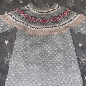 Säljer en mysig grå stickad tröja med ett vackert mönster i rosa och beige runt halsen. Bra för vinter barnen har knappt använt