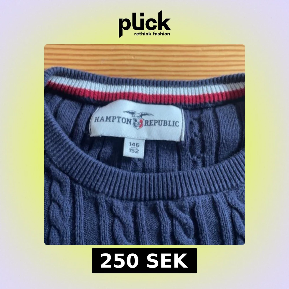 Säljer en stilren mörkblå kabelstickad tröja från Hampton Republic. Tröjan har en broderad logga i rött på bröstet och ribbade muddar vid ärmslut och nederkant. Perfekt för kyligare dagar!