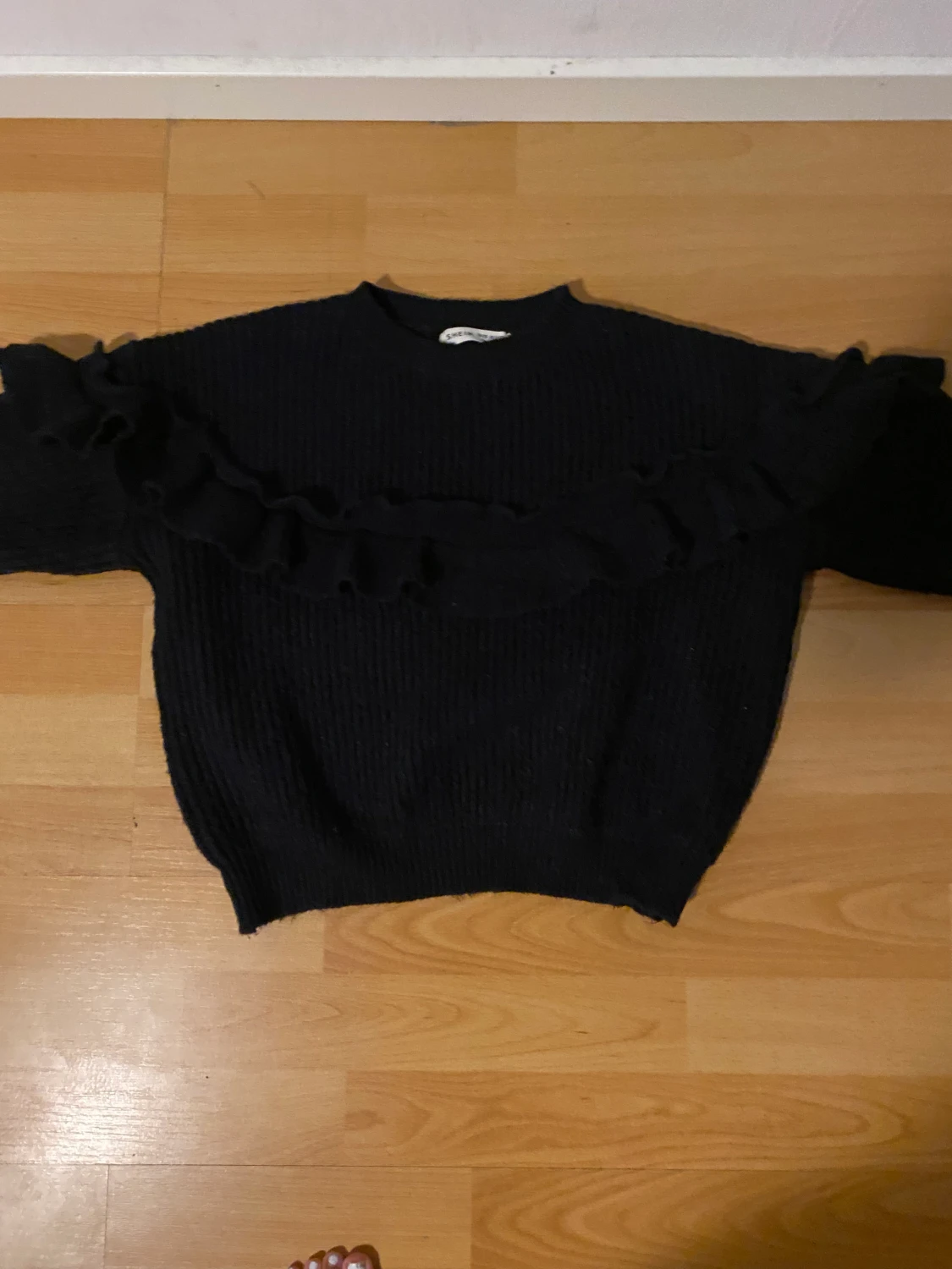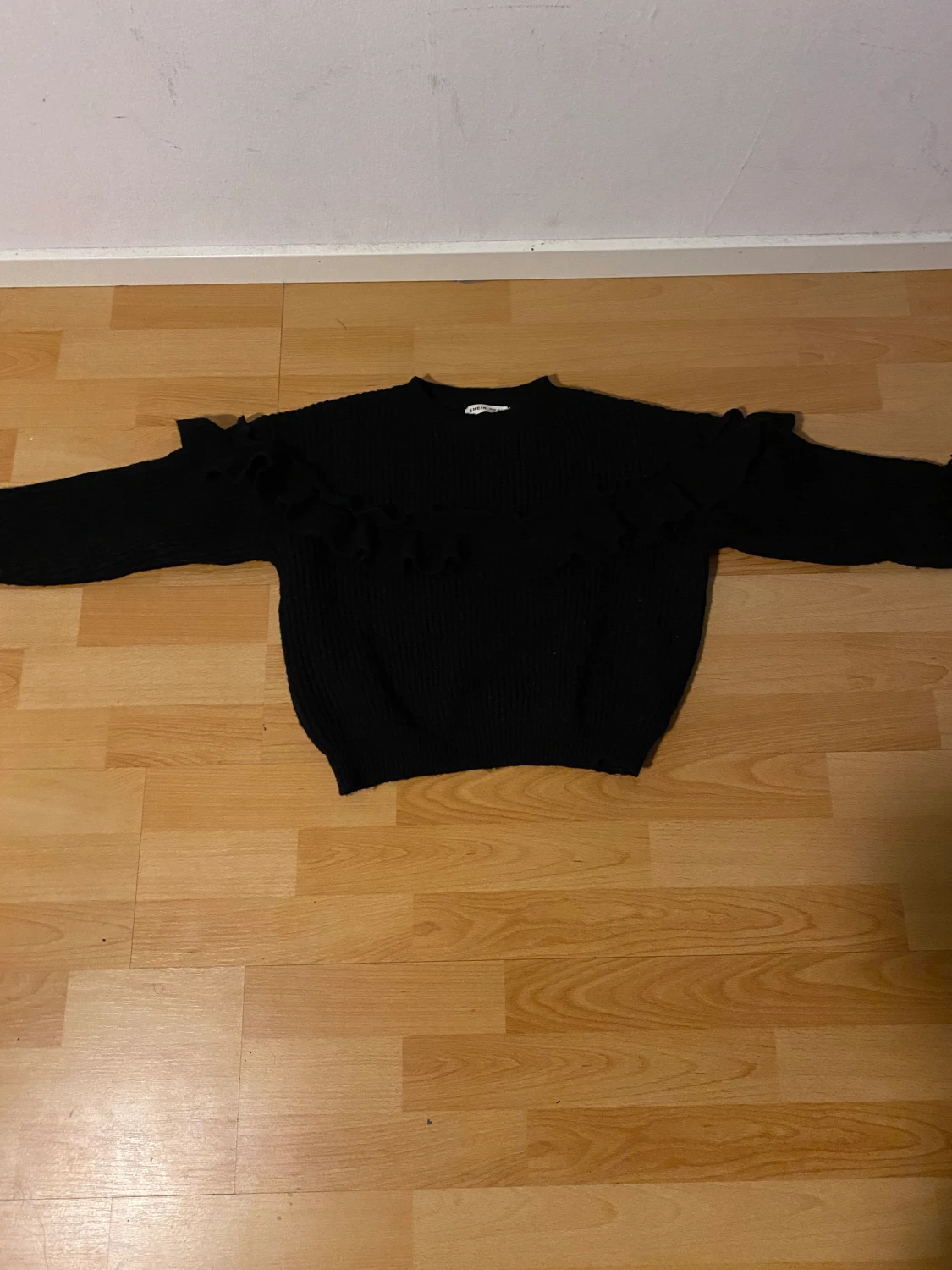 Jag säljer denna väldigt fina svarta stickade tröjan. Som har volanger på sidan av tröjan. Köparen står för frakten.