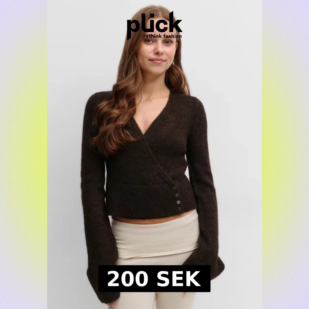 Mysig mörkbrun omlottkofta med v-ringning och långa ärmar. Koftan har en croppad passform och stängs med fyra knappar i sidan. Stickad i ett mjukt material som passar perfekt till höst och vinter.
