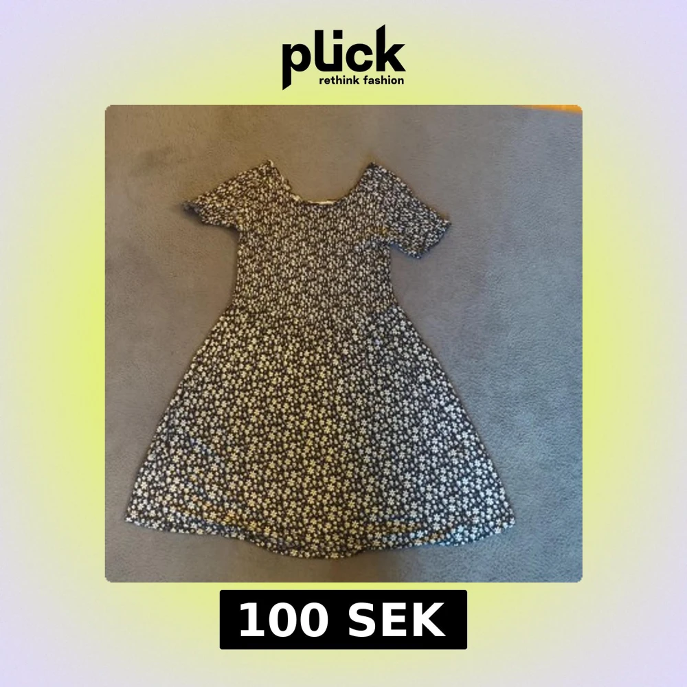 Supersöt svart klänning med vita små blommor över hela tyget. Klänningen har korta ärmar och en lätt utställd kjol. Den har även en stickad överdel.