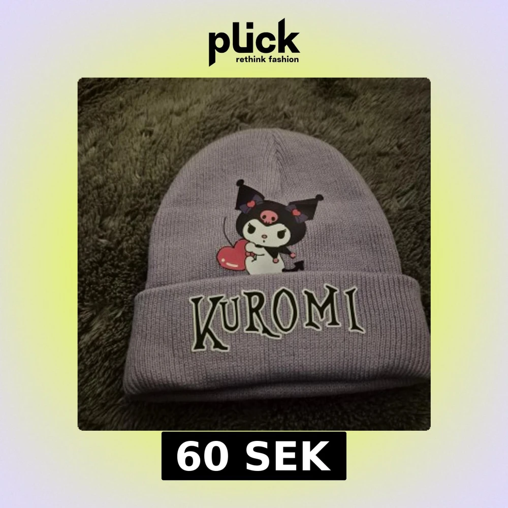 Säljer en söt lila stickad mössa med Kuromi-tryck framtill och texten 'Kuromi' på uppviket. Perfekt accessoar för dig som gillar kawaii-stil och vill sticka ut lite extra.