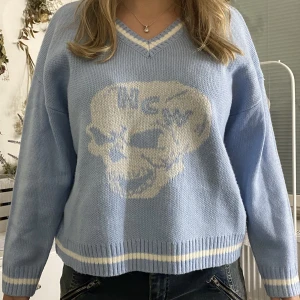 Snygg blå stickad tröja med en döskalle på. Skit fin och väldigt bekväm också💗 Bra passform också!
