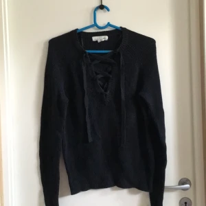 En svart stickad tröja med snörning fram. Mysigt material och lite längre tröja