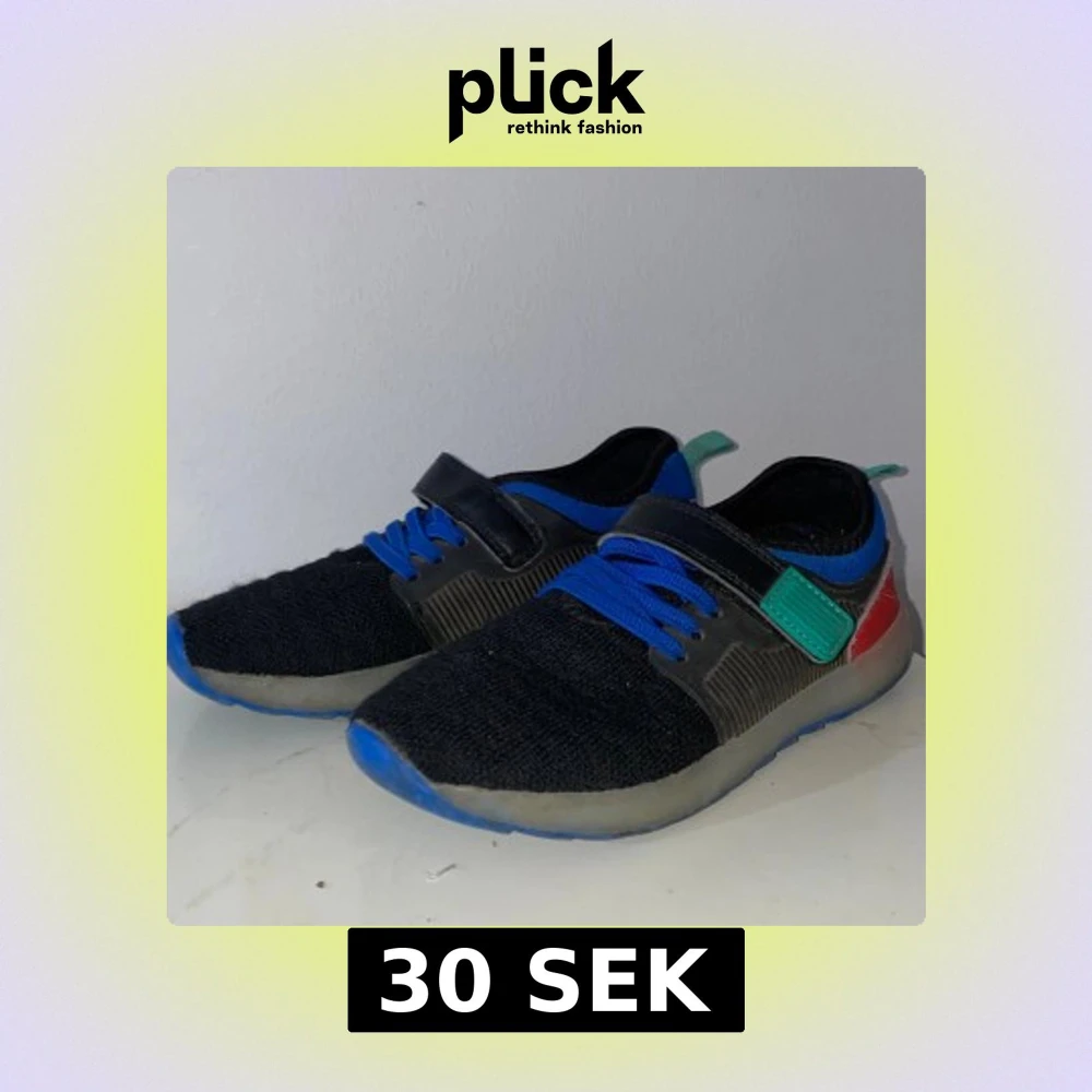 Snygga svarta sneakers med blå snören och blå sula. Skorna har en stickad ovandel, kardborreband med grönt spänne och röda detaljer på hälen. Perfekta för dig som gillar färg och sportig stil. Lätta och bekväma med platt sula. Eftersom den är gammal så står inte storleken på, men jag gissar på att den är 21