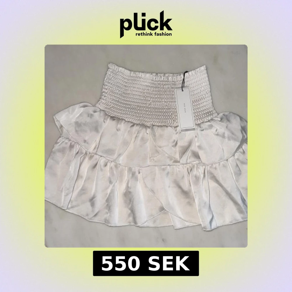 Supersöt kort kjol i pärlvit satin från Neo Noir med prislapp kostar 600 kr helt ny. Kjolen har bred smock i midjan och dubbla volanger som ger en riktigt flowy och trendig look. Perfekt att styla med en croppad topp eller stickad tröja för en fräsch vibe.
