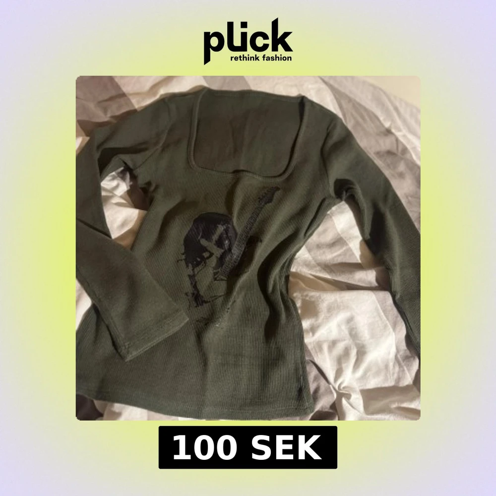 Olivgrön långärmad tröja med fyrkantig ringning och coolt svart tryck av en person med elgitarr på framsidan. Tröjan är ribbad och har en tight passform som framhäver siluetten. Perfekt för dig som gillar rockig stil.