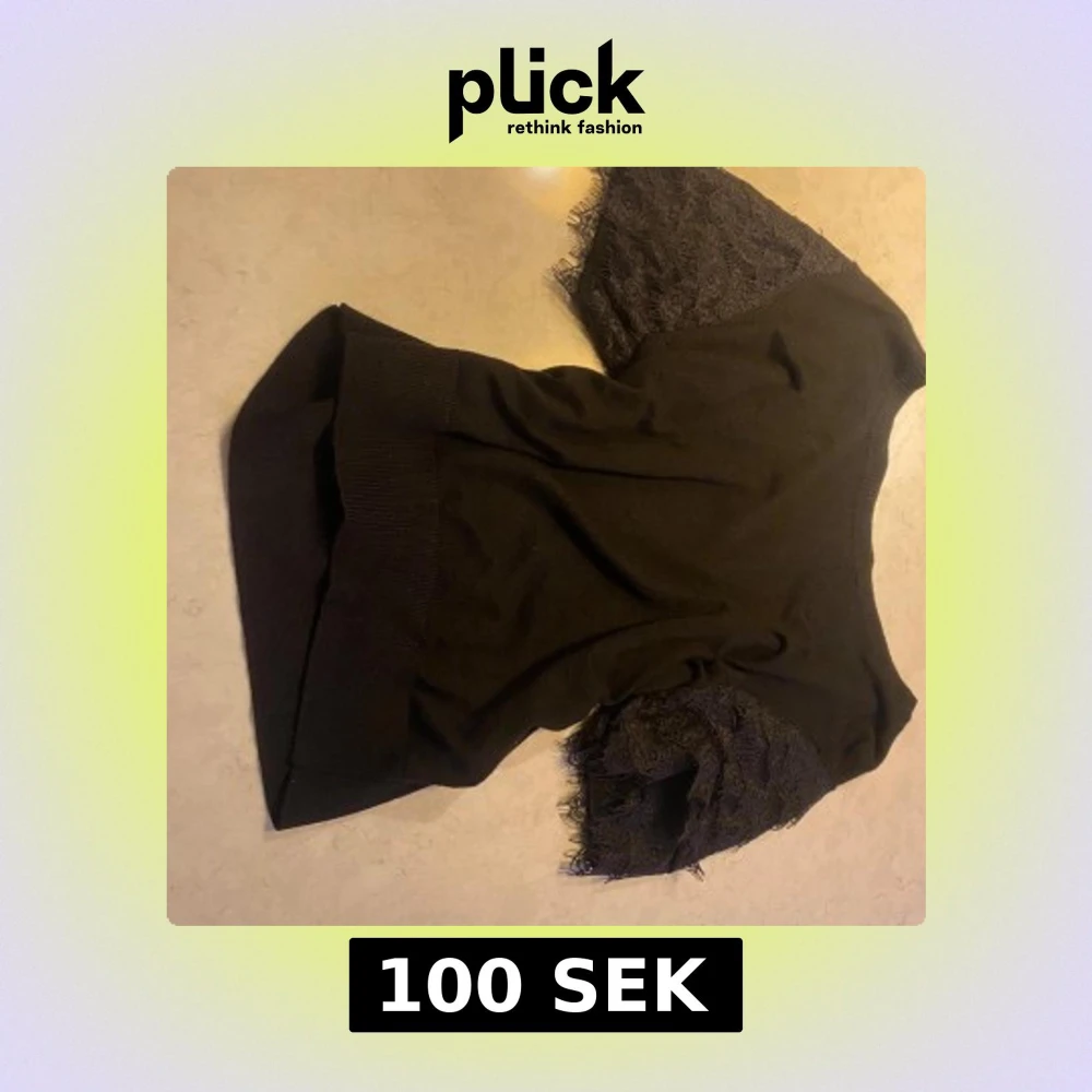 Säljer en svart topp med bred ribbad kant nedtill och korta ärmar i snygg spets med fransiga detaljer. Toppen har en mjuk, stickad känsla i kroppen och ärmarna har ett blommigt spetsmönster som ger en cool kontrast. Perfekt för dig som gillar stilrena plagg med twist.