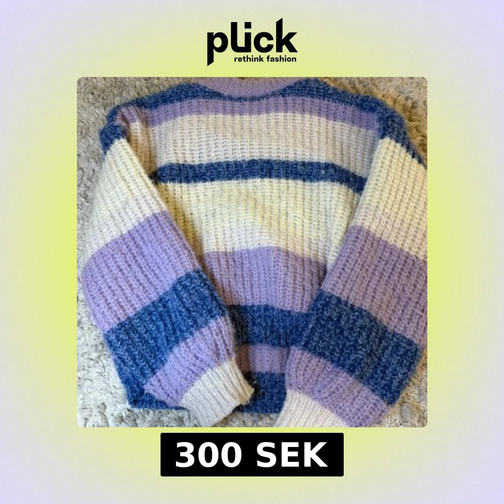 Mysig stickad tröja med breda ränder i lila, blått och vitt. Tröjan har lång ärm och en avslappnad passform, perfekt för kyliga dagar. Mjuk och fluffig känsla som ger en trendig look.