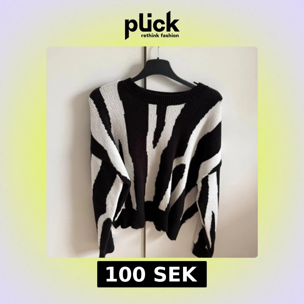 Säljer en stickad svart och vit tröja från Dilvin med zebramönster. Tröjan har rund halsringning och långa ärmar.
