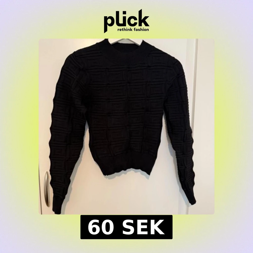 Säljer en svart stickad tröja med coolt strukturmönster i fyrkanter. Tröjan har lång ärm, ribbad halsringning och muddar. Perfekt för dig som gillar en stilren men ändå unik look.