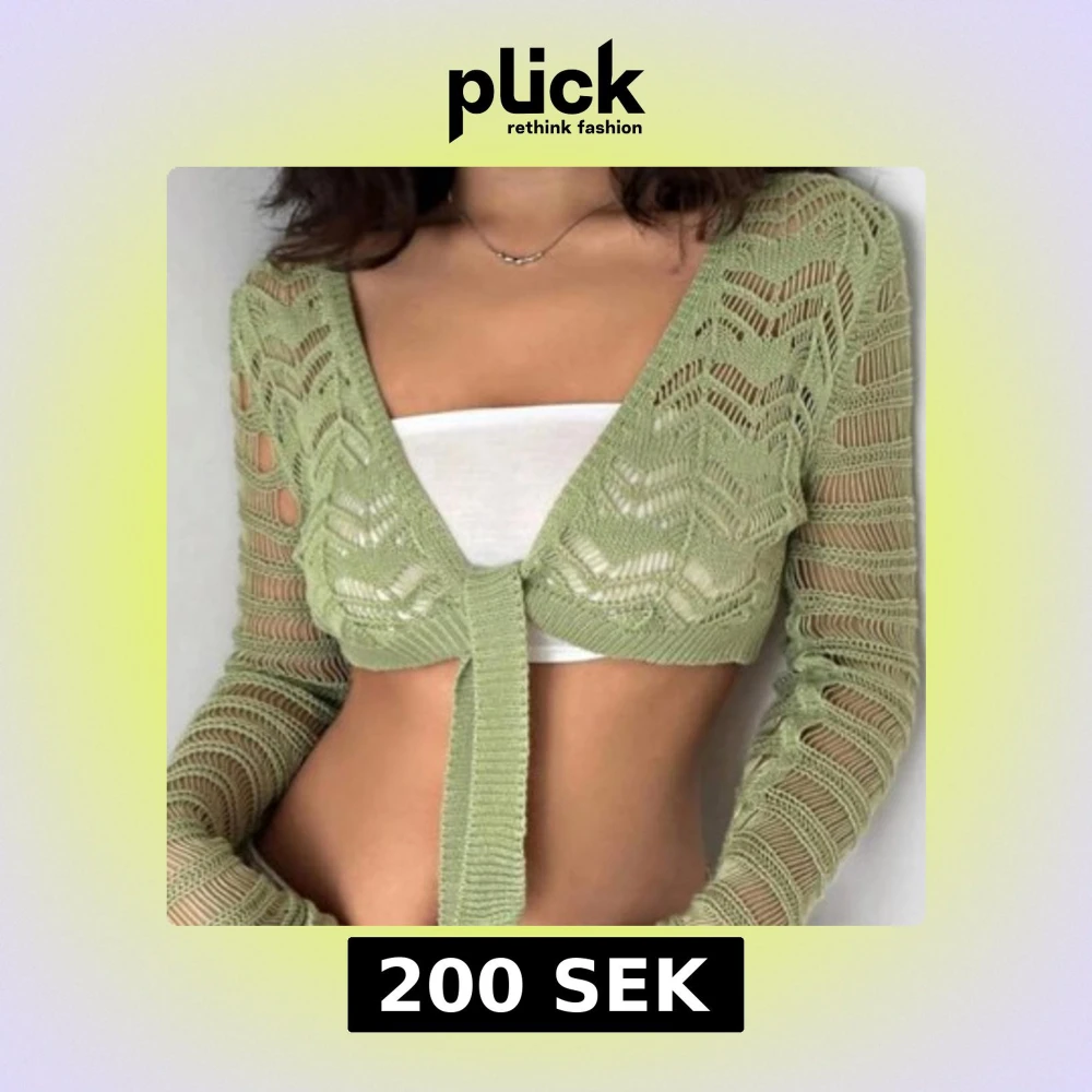 Snygg ljusgrön stickad bolerotopp med lång ärm och knyt framtill. Toppens mönster är hålstickat i vågigt zigzag-mönster och den är croppad. Perfekt att styla över ett linne eller tubtopp.