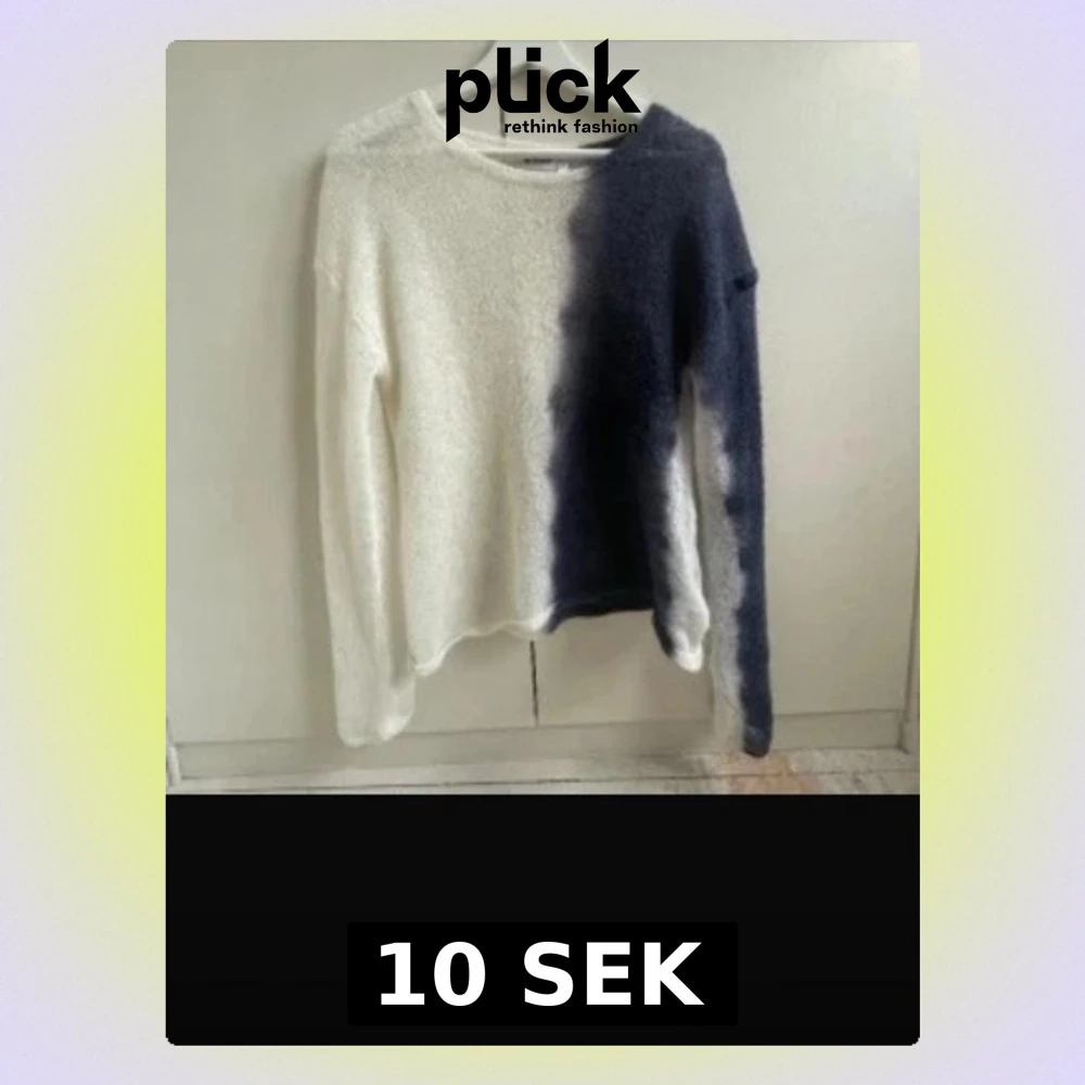 Säljer en unik stickad tröja med cool tvåfärgad design i vitt och mörkblått. Tröjan har långärmad passform och är mjuk och fluffig i materialet. Perfekt för dig som gillar att sticka ut med din stil och vill ha något annorlunda i garderoben.