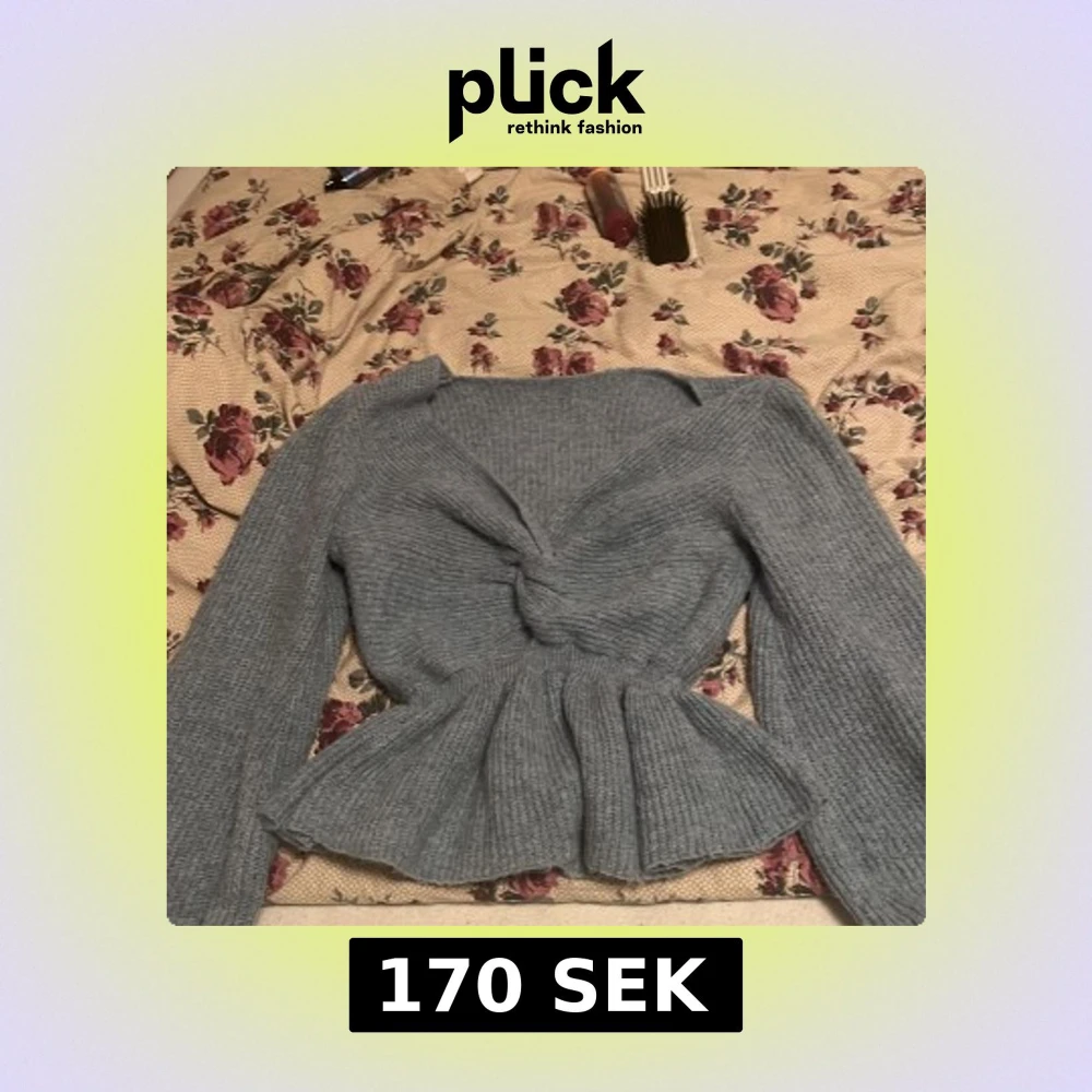 Superfin ljusblå stickad tröja med v-ringning och twistad detalj framtill. Tröjan har lång ärm och en peplum-liknande volang nertill som ger en snygg siluett. Perfekt för dig som vill ha något både mysigt och trendigt.