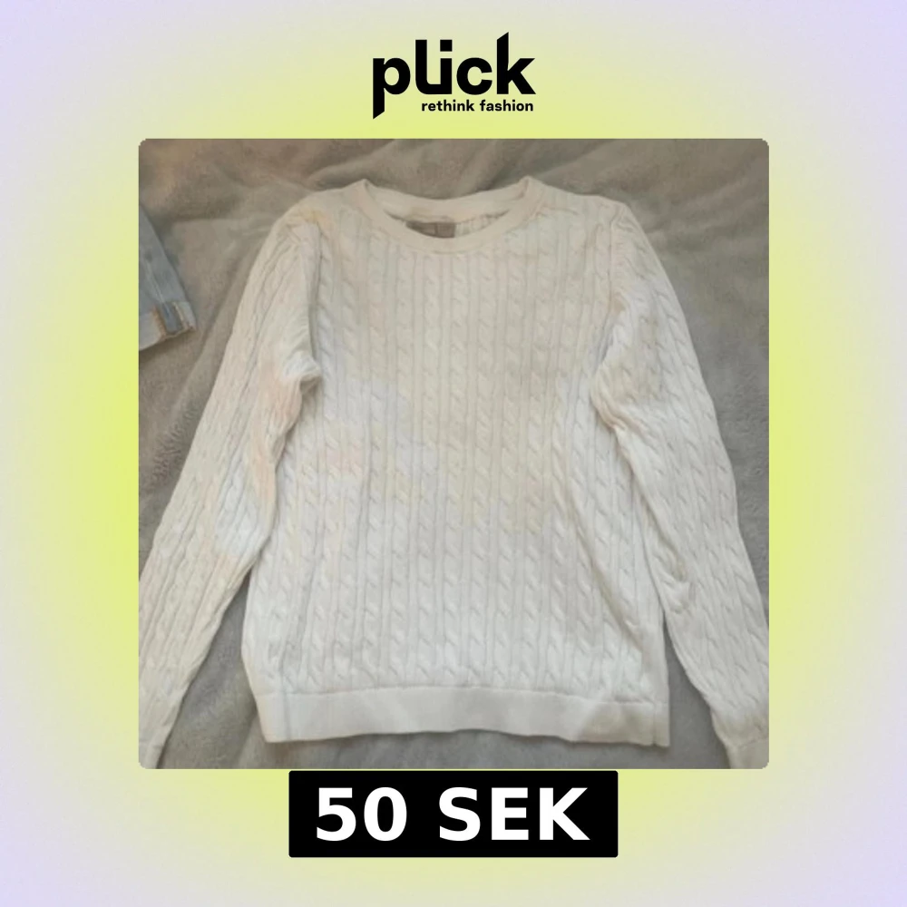 Säljer en vit kabelstickad tröja med rund hals och långa ärmar. Tröjan har ett klassiskt flätmönster och är gjord i mjukt material som passar perfekt för kyliga dagar. Enkel och stilren design som funkar till jeans eller kjol.