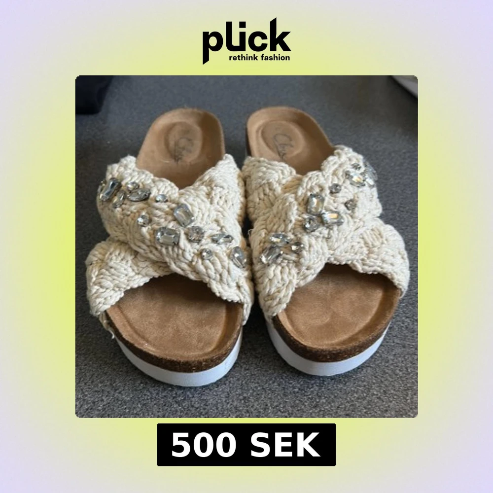 Snygga sandaler från Clarks med flätad beige ovandel i stickad stil och stora glittrande stenar. De har en plattformsula i vitt och brunt som ger extra höjd och en öppen tå för sommarens alla outfits.