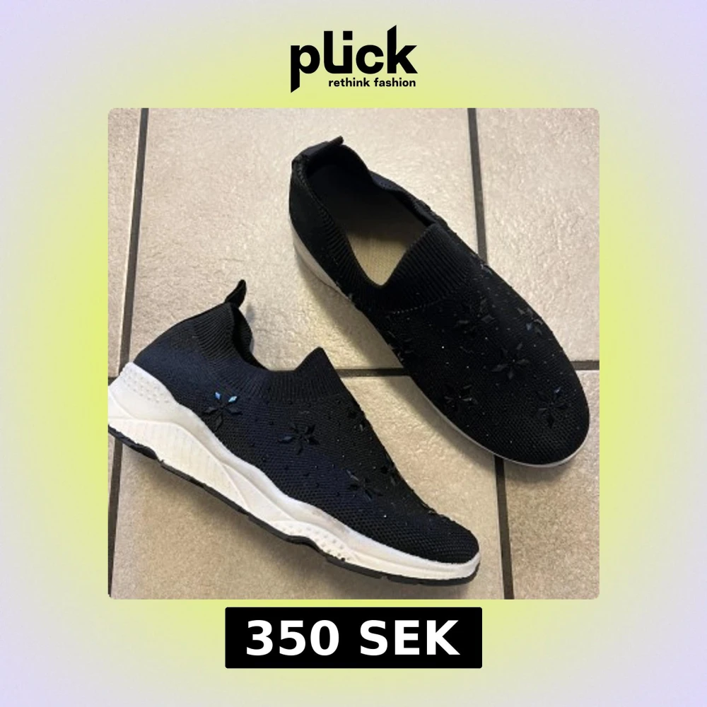 Säljer ett par svarta slip-on sneakers med vita sulor och blommiga dekorationer på ovandelen. Skorna är stickade och har en sportig, bekväm design utan snörning. Perfekta för dig som gillar stilrena och unika detaljer.