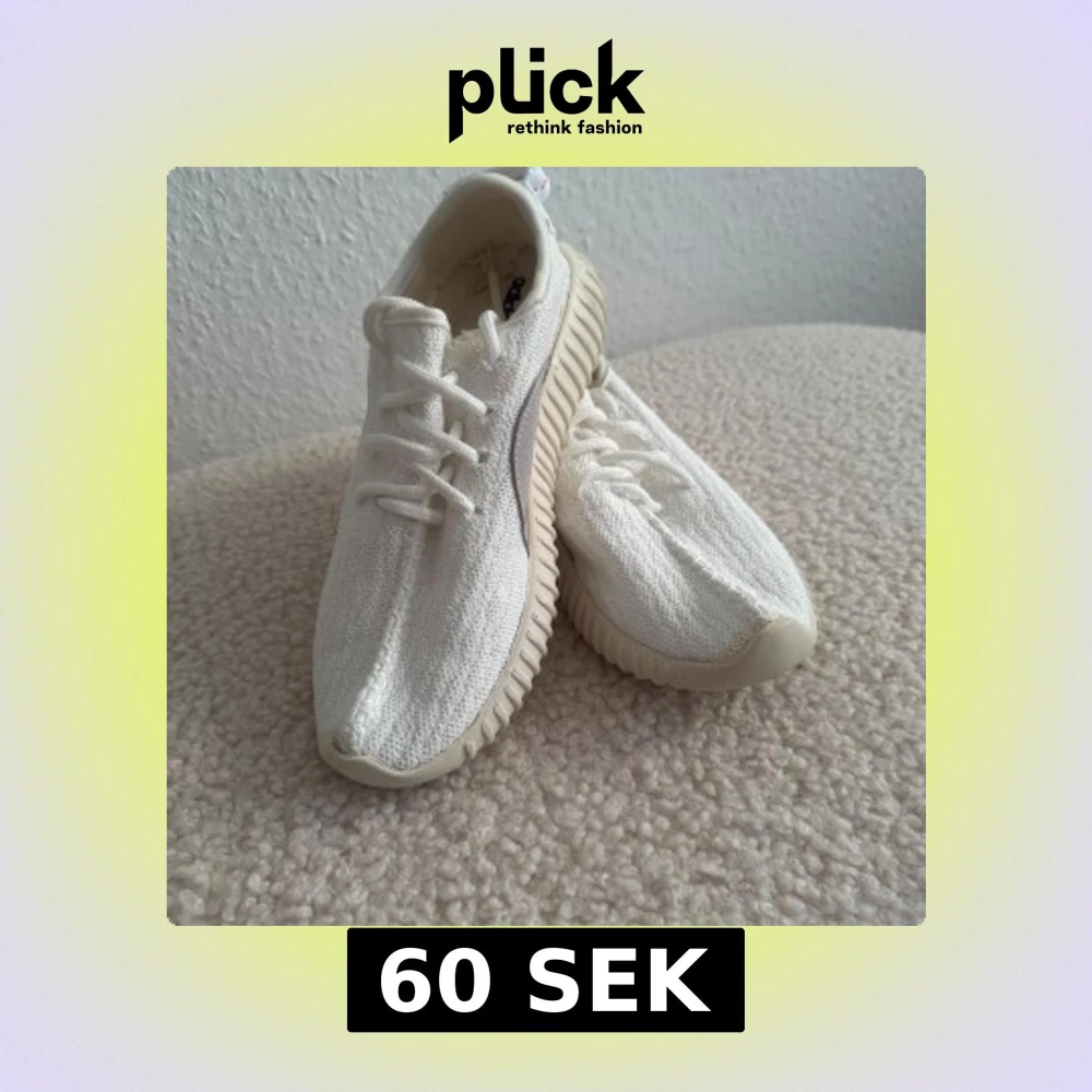 Snygga vita sneakers med chunky, räfflad sula och ovandel i stickad mesh. Skorna har snörning och en cool detalj baktill med vit och röd rem. Perfekta för dig som gillar en clean och modern stil. Titta på sista två bilder, framme släppte lite men man kan klistra om man är händig och lite färgade inne, men det var så, när jag köpte, syns inte när man har skorna på, därav priset på 60kr.