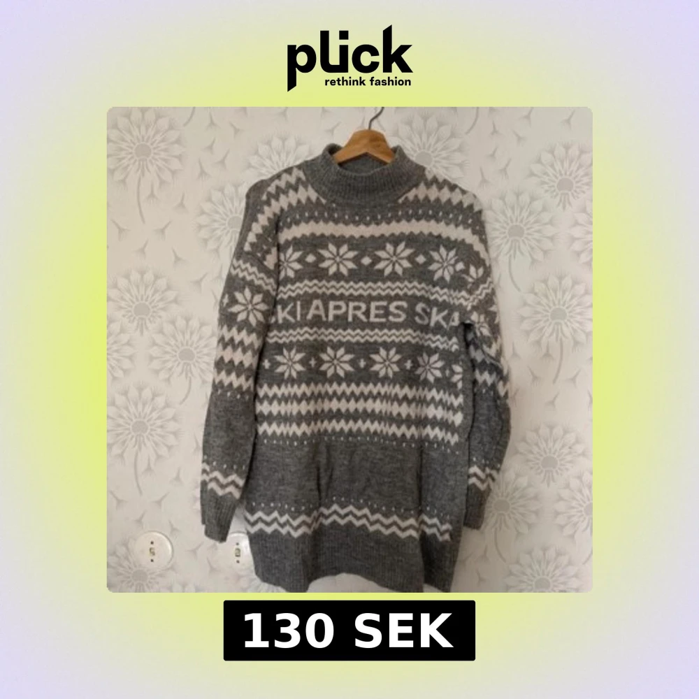 Säljer en mysig grå stickad tröja med vitt och grått mönster. Tröjan har texten 'SKI APRES SKI' och långa ärmar. Perfekt för kyliga dagar.använd 2 gånger inte så mycket