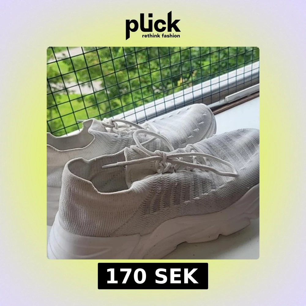 Säljer ett par vita chunky sneakers med stickad ovandel och snörning. Skorna har en tjock, mönstrad sula och en sportig look. Perfekta för dig som gillar stilrena och bekväma skor med modern känsla.