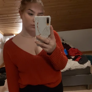 Slät och fin stickad tröja i julröd färg, X i ryggen och v-ringad