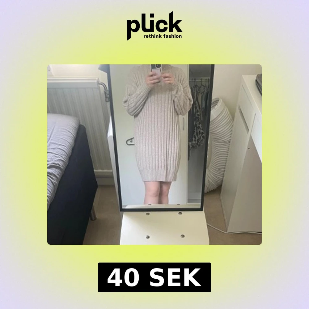 Mysig beige stickad klänning med ribbat mönster och polokrage. Långa ärmar och mjukt material som känns skönt mot huden. Perfekt för dig som gillar en enkel men stilren look.