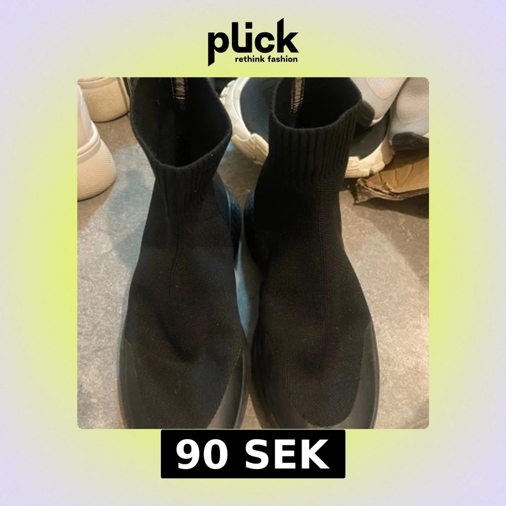 Svarta boots med stickad ovandel och ribbad skaft som sitter tight runt ankeln. Skorna har en platt, grov sula och är helt svarta med en sportig och modern look. Perfekta för dig som gillar streetstyle och vill ha något bekvämt men ändå snyggt.