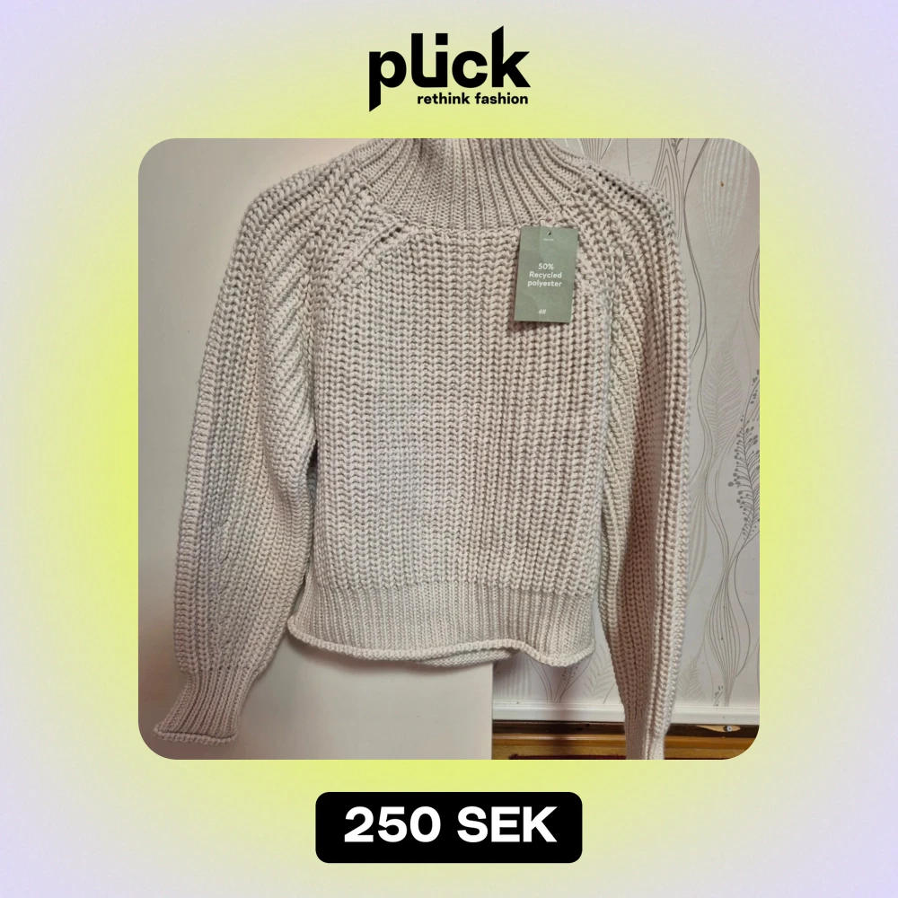 Säljer en ny och supermysig vit stickad tröja i 50% återvunnen polyester. Perfekt för kalla dagar med sin höga krage och långa ärmar. Tröjan har en härlig struktur och är både stilren och bekväm. Passar perfekt till både vardag och fest!