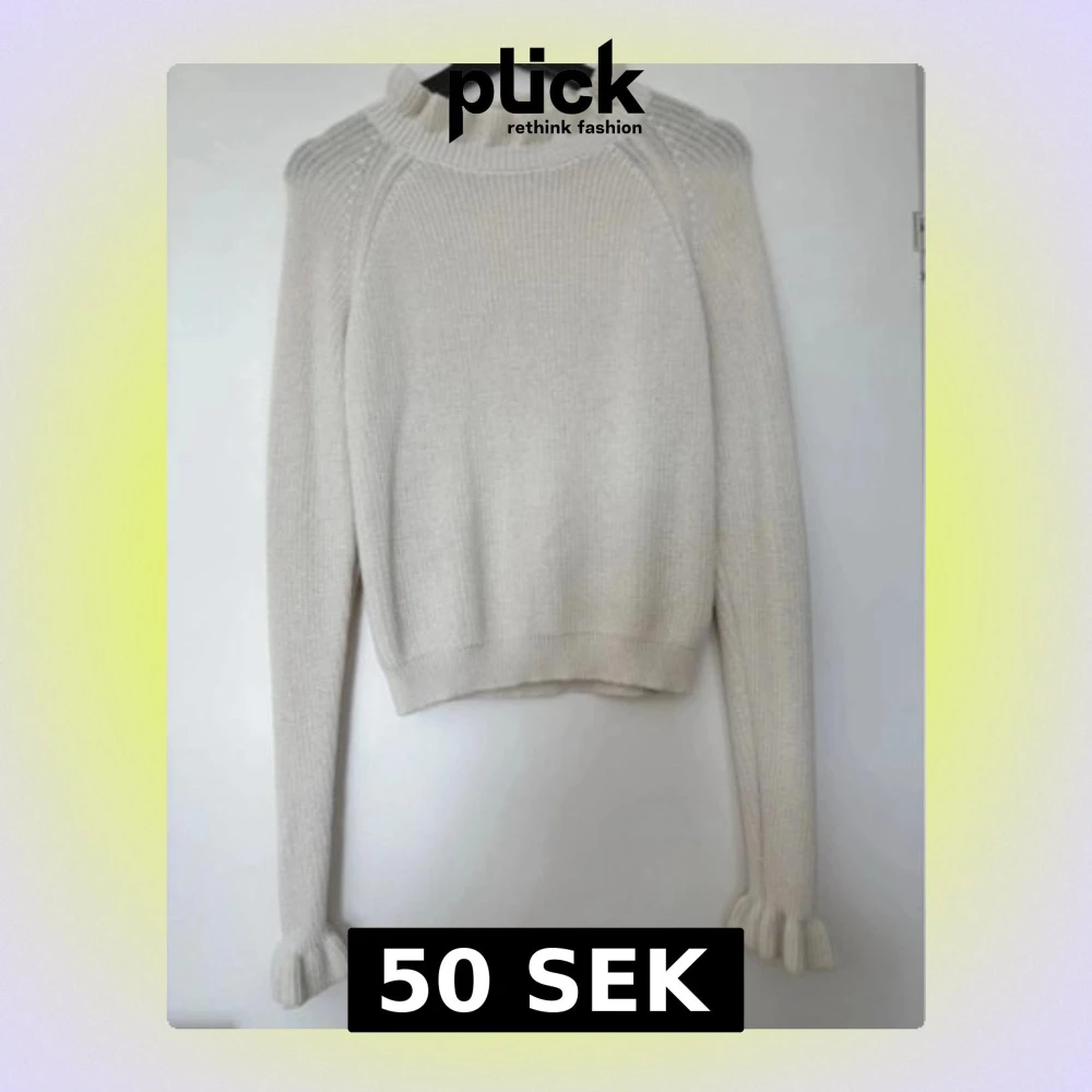 Supersöt vit stickad tröja med volangdetaljer vid krage och ärmslut. Tröjan har långärmade raglanärmar och en ribbad, croppad nederkant. Perfekt för dig som gillar mjuka och romantiska vibes i din garderob. Fint skick, inte använd mycket, ev lite noppror som syns på bild nere vid resår. Cremevit Djur och rökfritt hem 🏠