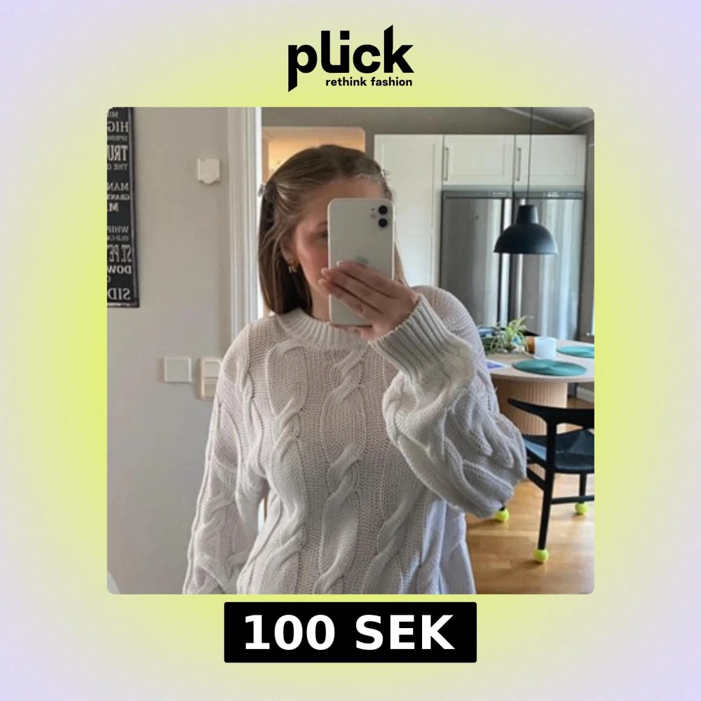 Säljer en vit kabelstickad tröja med grov struktur och rund hals. Tröjan har långa ärmar och breda ribbade muddar vid ärmslut och nederkant. Perfekt för kyligare dagar och enkel att matcha med olika outfits.