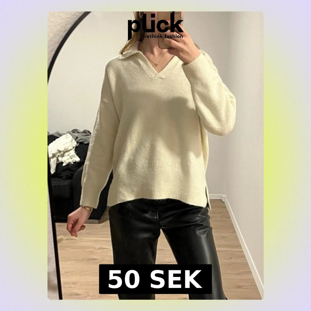 Säljer en beige stickad polotröja med v-ringning och krage. Tröjan har lång ärm, ribbade muddar och slits i sidorna. Oversized och chill passform, perfekt till skinnbyxor eller jeans.