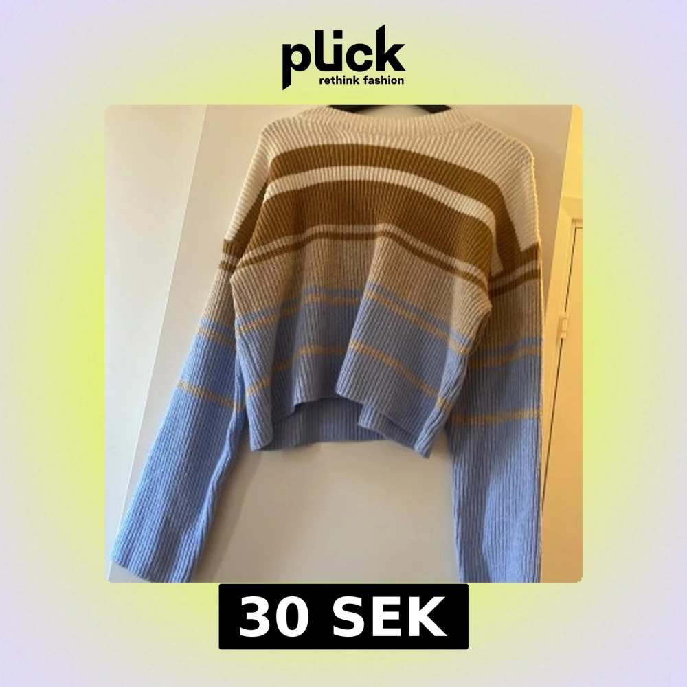 Säljer en mysig stickad tröja med randigt mönster i blått, brunt och vitt. Tröjan har långa ärmar och en croppad passform, perfekt för kyliga dagar. Den ribbade strukturen ger en extra touch av stil. Perfekt för höst och vinter!