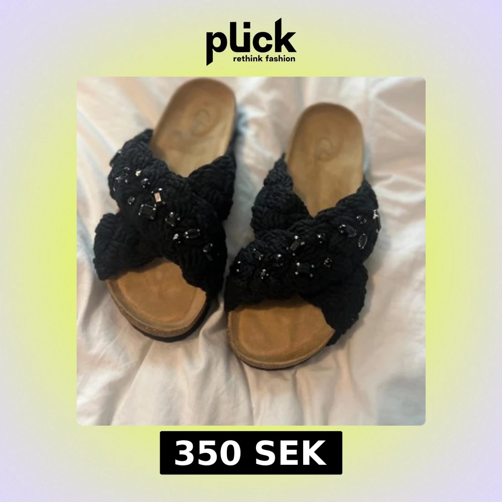 Snygga svarta tofflor med breda, flätade band i stickad bomull och glittrande svarta pärlor. Platt sula i beige mocka-look och öppen tå. Perfekta för en trendig sommarstil.